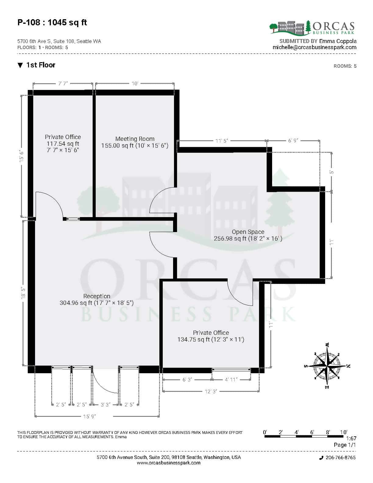 Orcas Business Park has a 1st-floor unit available soon that is 1045 square feet with 3 private offices, a large front entry. This unit is renting for $2,300.00 Gross, with no additional NNN charges. We offer discounted rates for longer term Leases. We also offer our service with a smile.